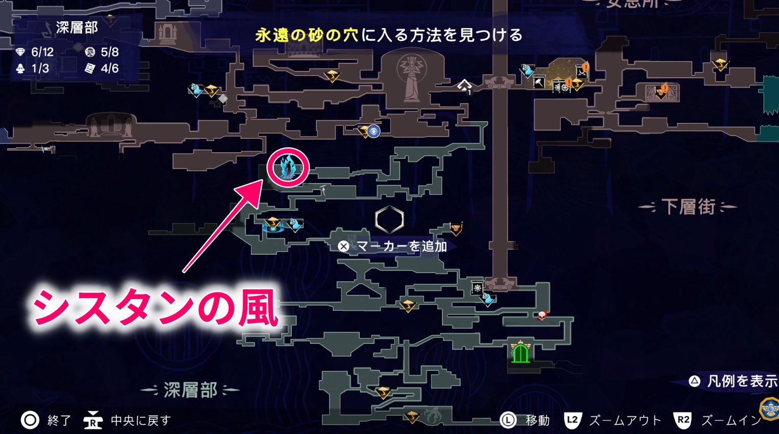 深層部(カタコンペ)に移動して、永遠の砂の穴入口にある封印を解く(3カ所)