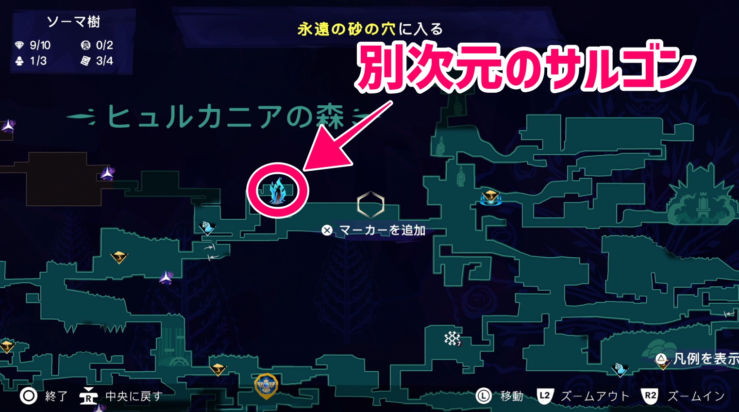 左に進んだ先にある、最寄のファストトラベル(森の遺跡)を使用する(右方向にあるファストトラベルには今は進めない)