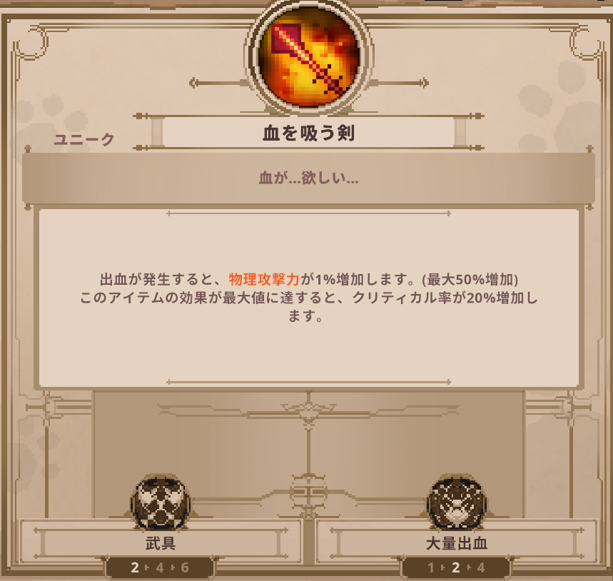 アイテム Skul: The Hero Slayer | 血を吸う剣の詳細 アイテム 2025.04.18 このページでは、Skul: The Hero Slayerに登場する血を吸う剣の詳細を掲載しています。 血を吸う剣のステータス 血を吸う剣のスキル ▶️アイテム一覧 に戻る