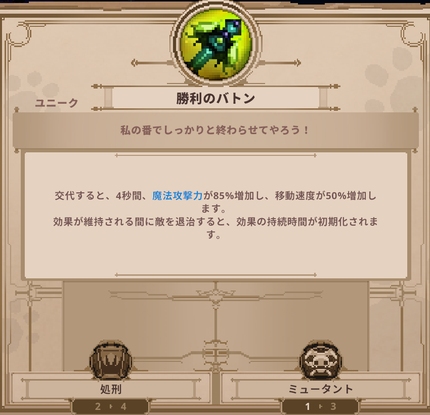 アイテム Skul: The Hero Slayer | 勝利のバトンの詳細 アイテム 2025.04.18 このページでは、Skul: The Hero Slayerに登場する勝利のバトンの詳細を掲載しています。 勝利のバトンのステータス 勝利のバトンのスキル ▶️アイテム一覧 に戻る