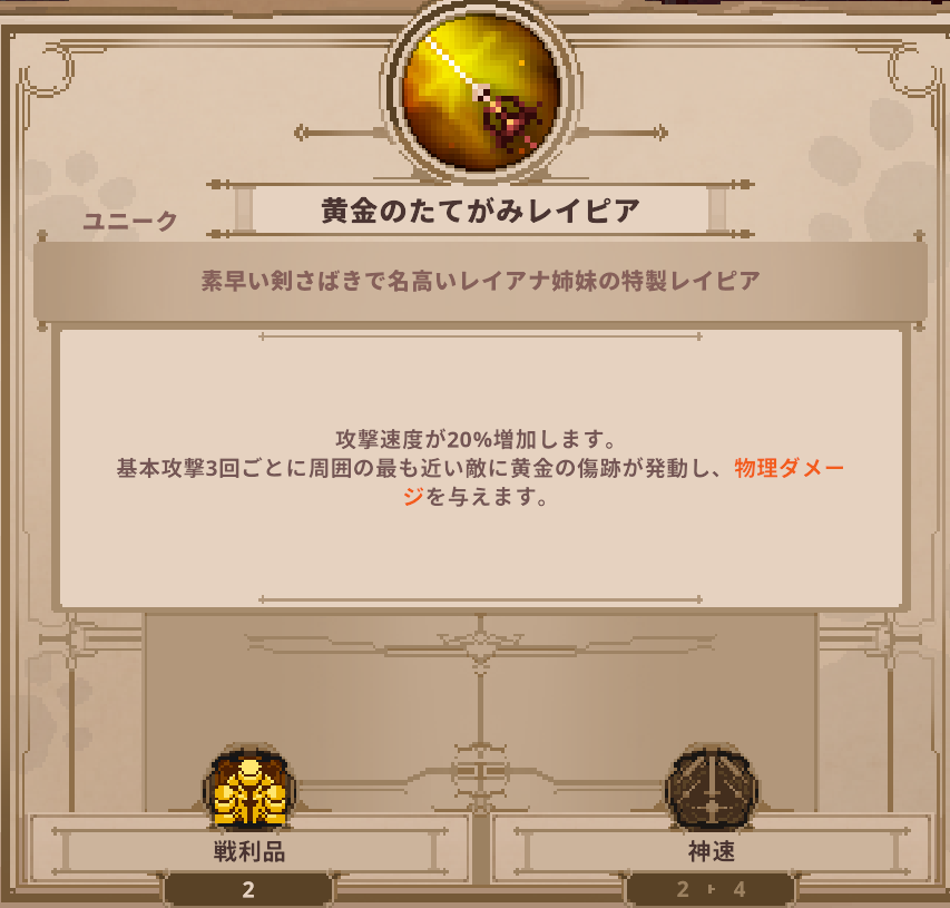 アイテム Skul: The Hero Slayer | 黄金のたてがみレイピアの詳細 アイテム 2025.04.18 このページでは、Skul: The Hero Slayerに登場する黄金のたてがみレイピアの詳細を掲載しています。 黄金のたてがみレイピアのステータス 黄金のたてがみレイピアのスキル ▶️アイテム一覧 に戻る