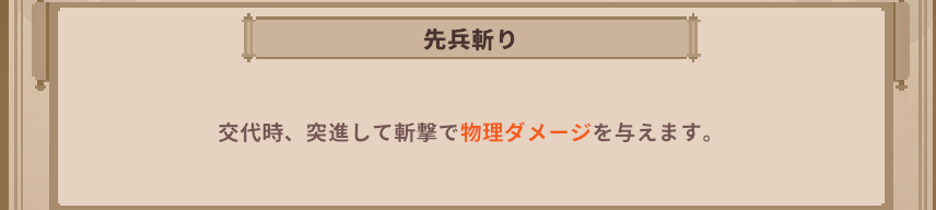 | ユニーク | カーリアン将校 | 中隊員の物理攻撃力+20% 攻撃がヒットする度に精神ゲージ上昇 精神ゲージ最大時ボタン入力で中隊員が7秒間攻撃、移動速度+100% |