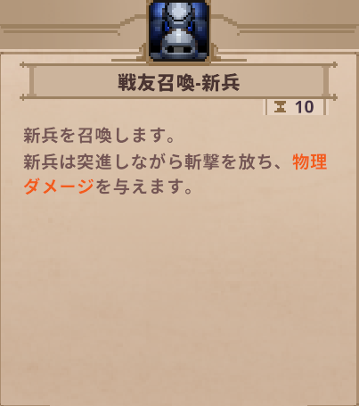 | レジェンド | カーリアン司令官 | 部隊員の物理攻撃力+20% 攻撃がヒットする度に精神ゲージ上昇 精神ゲージ最大時ボタン入力で中隊員が7秒間攻撃、移動速度+100%、物理攻撃力+30% 交代時、10秒間部隊員3人召喚 |