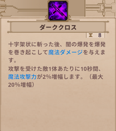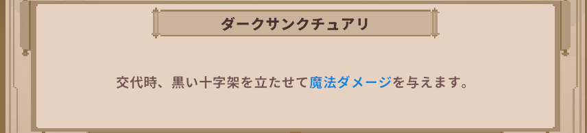 | レジェンド | ダークアベンジャー | 基本攻撃時、剣気を飛ばし魔法ダメージ 交代時に立てる十字架の近くで魔法攻撃力+30% |