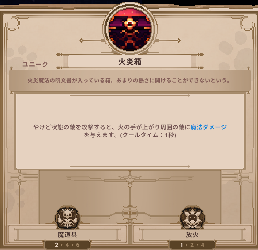 アイテム Skul: The Hero Slayer | 火炎箱の詳細 アイテム 2025.04.19 このページでは、Skul: The Hero Slayerに登場する火炎箱の詳細を掲載しています。 火炎箱のステータス 火炎箱のスキル ▶️アイテム一覧 に戻る
