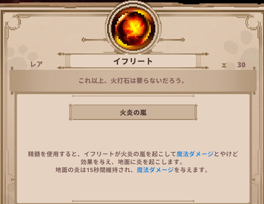 精髄 Skul: The Hero Slayer | イフリートの詳細 精髄 2025.04.19 このページでは、Skul: The Hero Slayerに登場するイフリートの詳細を掲載しています。 イフリートのステータス ▶️精髄一覧 に戻る