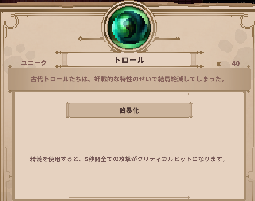 精髄 Skul: The Hero Slayer | トロールの詳細 精髄 2025.04.19 このページでは、Skul: The Hero Slayerに登場するトロールの詳細を掲載しています。 トロールのステータス ▶️精髄一覧 に戻る