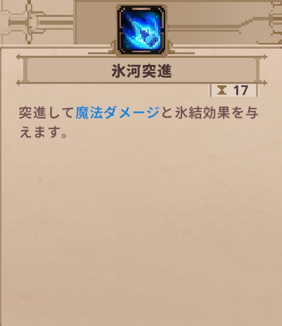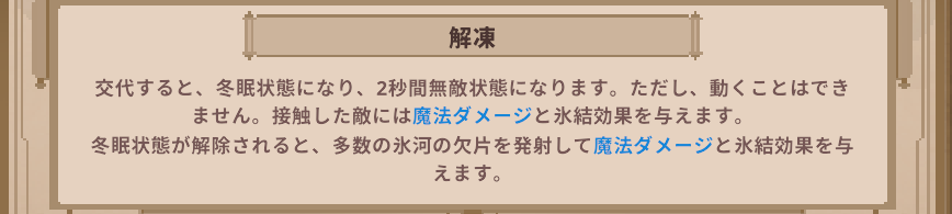 | レジェンド | 凍り付いた魂 | 基本攻撃時、氷結付与+3% 氷結状態の敵に接近しボタンで氷河割り発動で魔法ダメージ 冬眠後、15秒間基本攻撃が強化 |