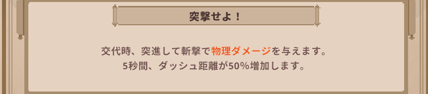 | ユニーク | 先鋒隊 | ジャンプ攻撃がダッシュ攻撃判定になる |