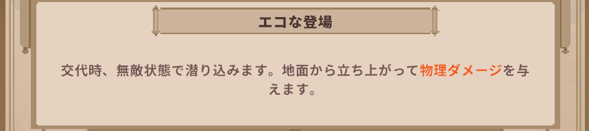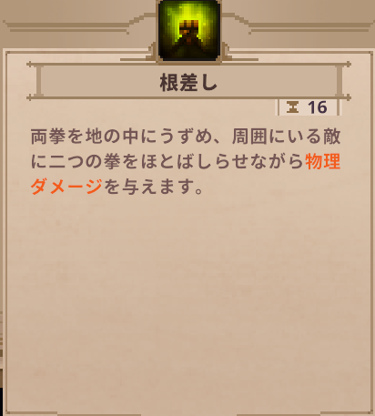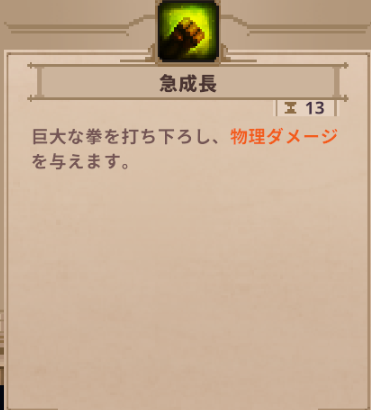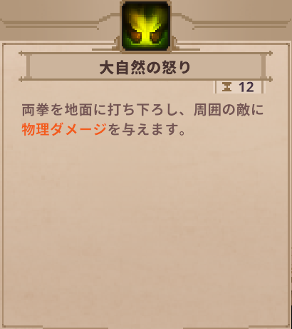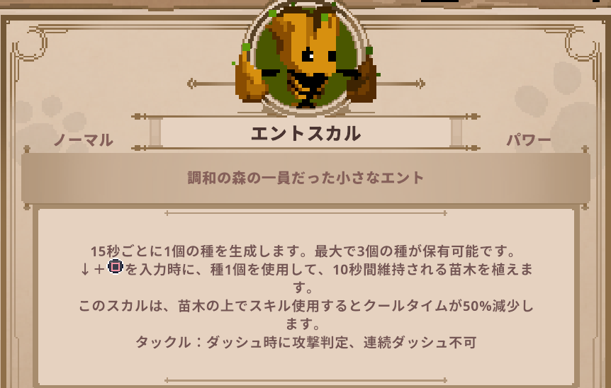 | ユニーク | 巨大なエントスカル | 種の保有が+1個(全4個) 苗木の上の被ダメージー30%、スキル強化 交代時、トゲと共に地面から物理ダメージ、その場に苗木を植える |