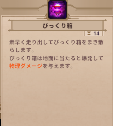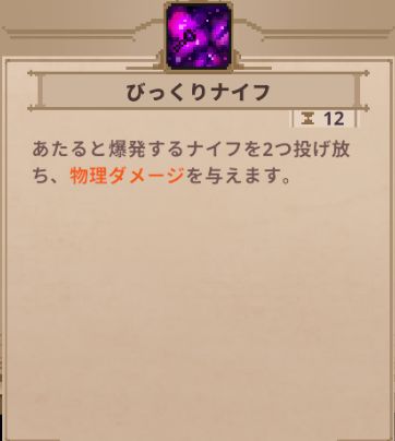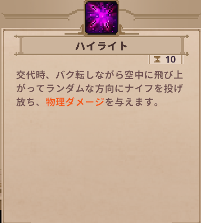 | ユニーク | ピエロ(ユニーク) | 基本攻撃時、30%の確率でナイフを2つ投げる 交代時、びっくりナイフを投げて物理ダメージ |