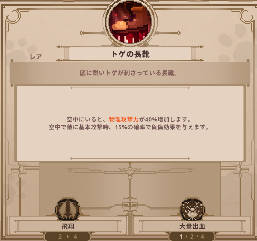 アイテム Skul: The Hero Slayer | トゲの長靴の詳細 アイテム 2025.04.17 このページでは、Skul: The Hero Slayerに登場するトゲの長靴の詳細を掲載しています。 トゲの長靴のステータス トゲの長靴のスキル ▶️アイテム一覧 に戻る