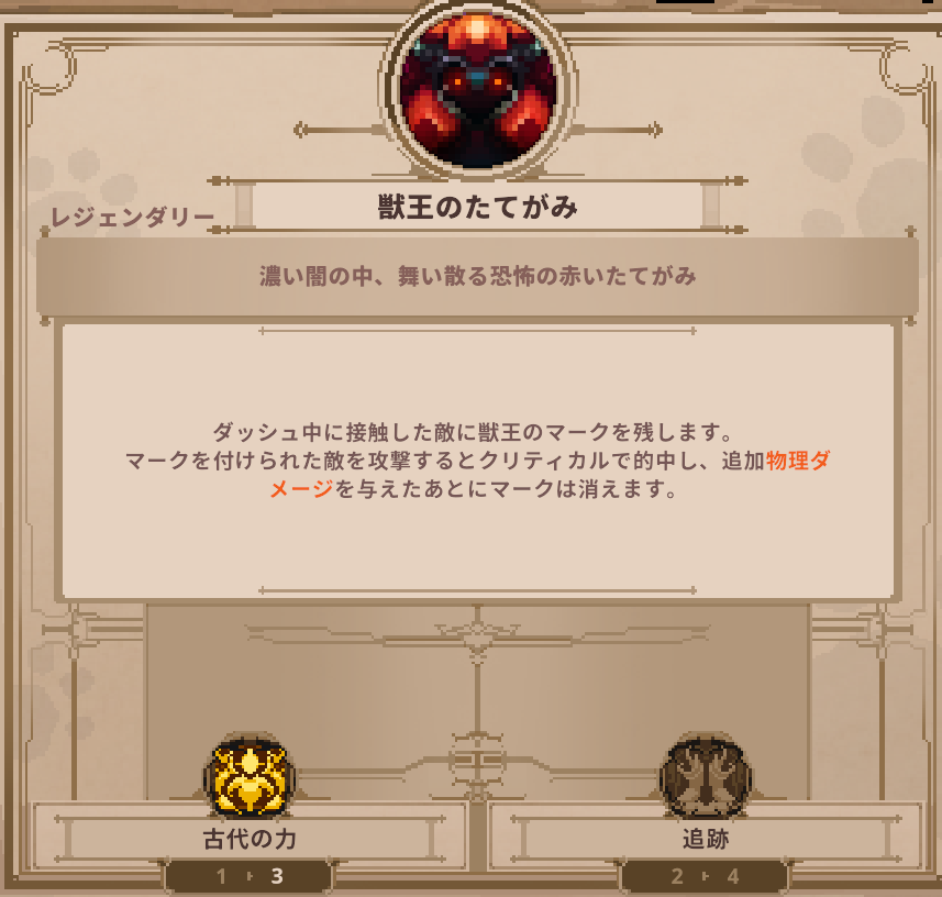 アイテム Skul: The Hero Slayer | 獣王のたてがみの詳細 アイテム 2025.04.18 このページでは、Skul: The Hero Slayerに登場する獣王のたてがみの詳細を掲載しています。 獣王のたてがみのステータス 獣王のたてがみのスキル ▶️アイテム一覧 に戻る