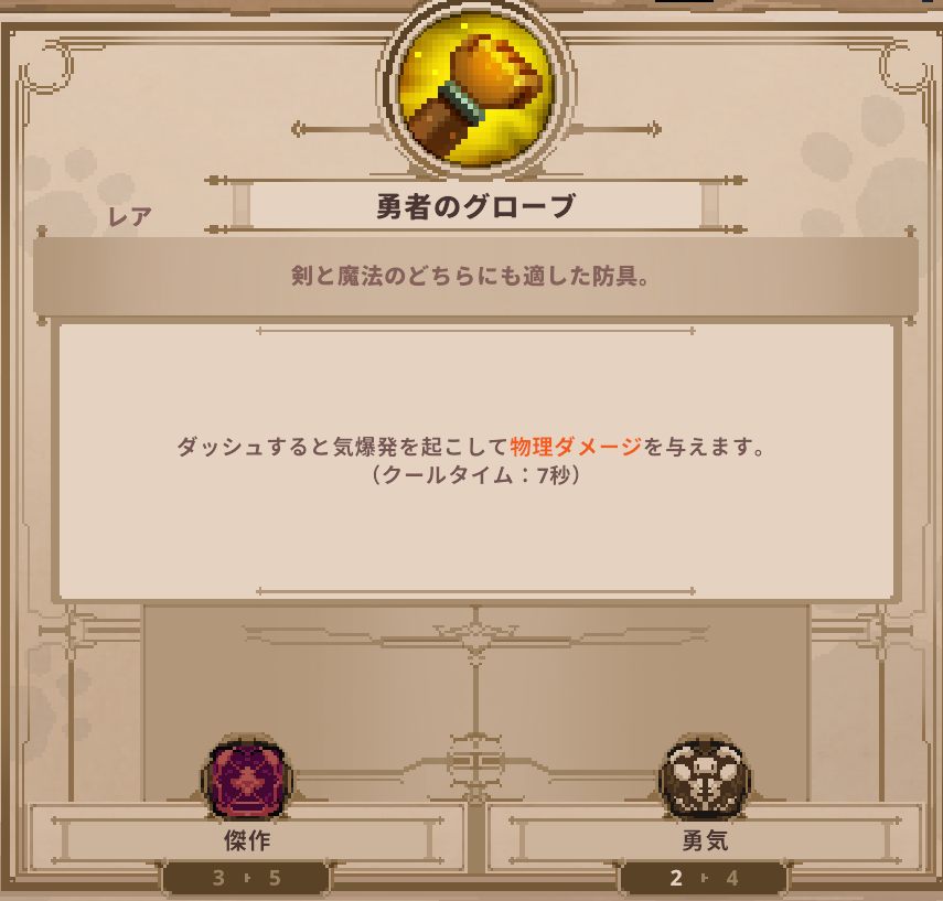 アイテム Skul: The Hero Slayer | 勇者のグローブの詳細 アイテム 2025.04.18 このページでは、Skul: The Hero Slayerに登場する勇者のグローブの詳細を掲載しています。 勇者のグローブのステータス 勇者のグローブのスキル ▶️アイテム一覧 に戻る