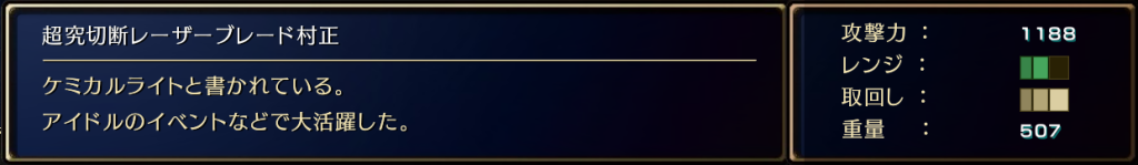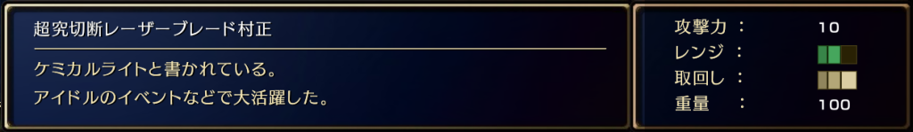 武器 アストリブラ | 超究切断レーザーブレード村正の詳細 武器 2025.05.062025.05.13 このページでは、アストリブラの超究切断レーザーブレード村正についての入手方法などの詳細を掲載しています。 超究切断レーザーブレード村正のステータス 超究切断レーザーブレード村正の入手方法 ・追章でアヌリスを復活させた後、「愛情」を14個使用し酒場にいるアヌリスに話しかける 超究切断レーザーブレード村正の習得技 ・性能強化(魔導クリスタル+1)・電池 超究切断レーザーブレード村正のボード装着強化値(追章から) 強化例(取得するボードの内容でステータスが若干異なります) ➡️武器一覧 に移動する
