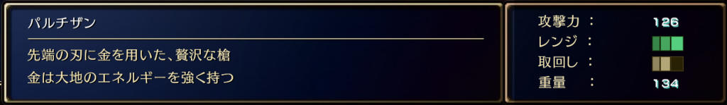 武器 アストリブラ | パルチザンの詳細 武器 2025.04.252025.05.13 このページでは、アストリブラのパルチザンについての入手方法などの詳細を掲載しています。 パルチザンのステータス パルチザンの入手方法 購入 店:ベルケイド火山のモキュンショップ 必要素材 ・アイアンインゴット×2・デーモンの角×1・ゴーレムの破片×1 パルチザンの習得技 ・性能強化(魔導クリスタル+1) パルチザンのボード装着強化値(追章から) 強化例(取得するボードの内容でステータスが若干異なります) ※準備中 ➡️武器一覧 に移動する
