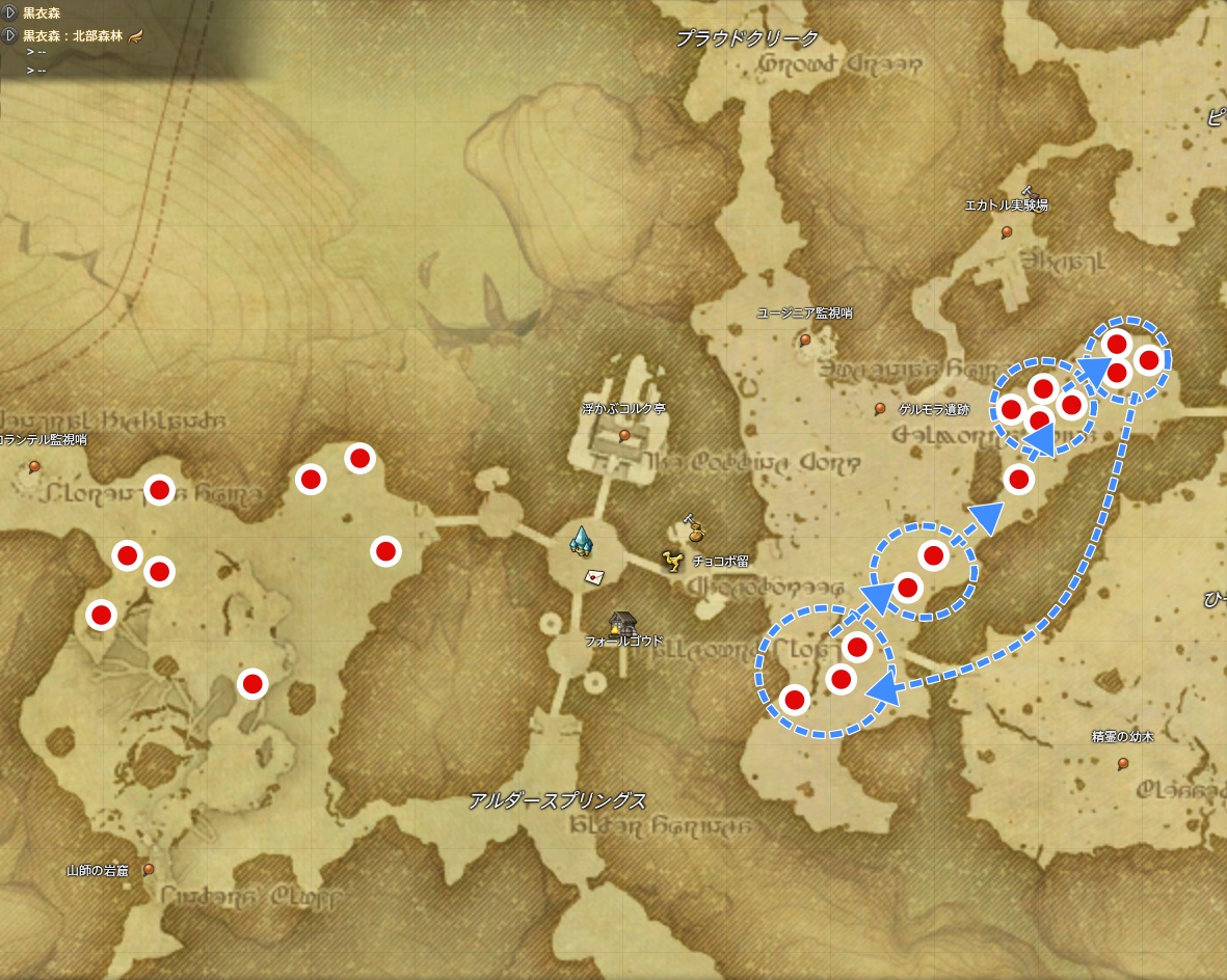 点線で囲まれたグループごとに倒して進んでいくと、約1分20秒ほどで13匹倒して回ることができる。(※1発で倒せることを前提とする)