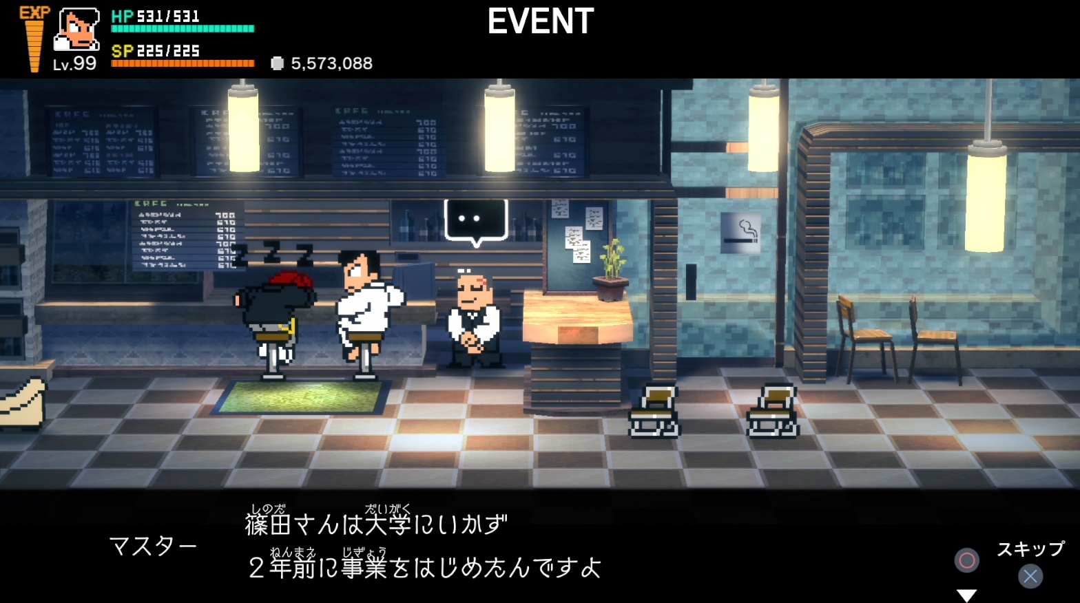 ※選択肢『もうちょっと冷峰のこと教えてくれよ』を繰り返し、マスターから篠田が事業をしている内容の話が聞けるまで会話を続ける。